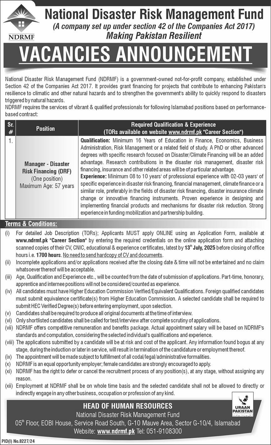 Vacant posts including manager drf, manager disaster risk financing and manager are announced in National Disaster Risk Management Fund NDRMF G-10/4 Islamabad, islamabad Islamabad Pakistan as per 29 May 2025 advertisement in daily Express Newspaper. Candidates with Phd, Master and Others etc. educational background will be preferred.
