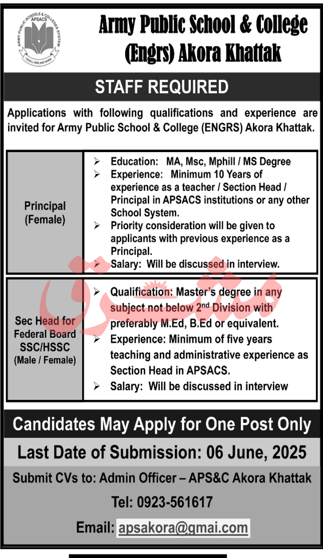 Army Public School & College APS&C is looking for candidates for following posts as per job advertisement published in daily Mashriq Newspaper of June 4, 2025 for location Akora Khattak, akora khattak Khyber Pakhtunkhwa KPK Pakistan: