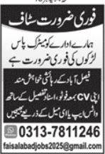 Vacant posts including male staff are announced in Private Company Faisalabad, faisalabad Punjab Pakistan as per 23 May 2025 advertisement in daily Jang Newspaper. Preferred Education is Matric etc.
