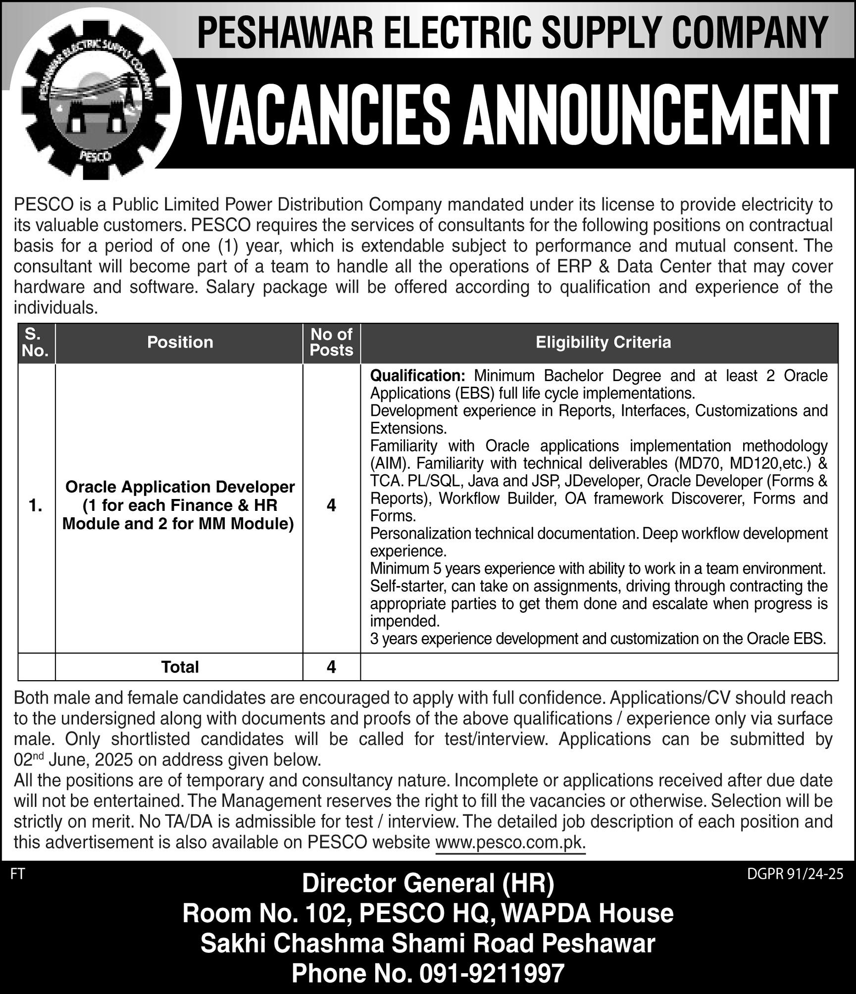 Peshawar Electric Supply Company PESCO is looking for candidates for following posts advertisement published in daily Other Newspaper of May 16, 2025 for location Peshawar, peshawar Khyber Pakhtunkhwa KPK Pakistan: