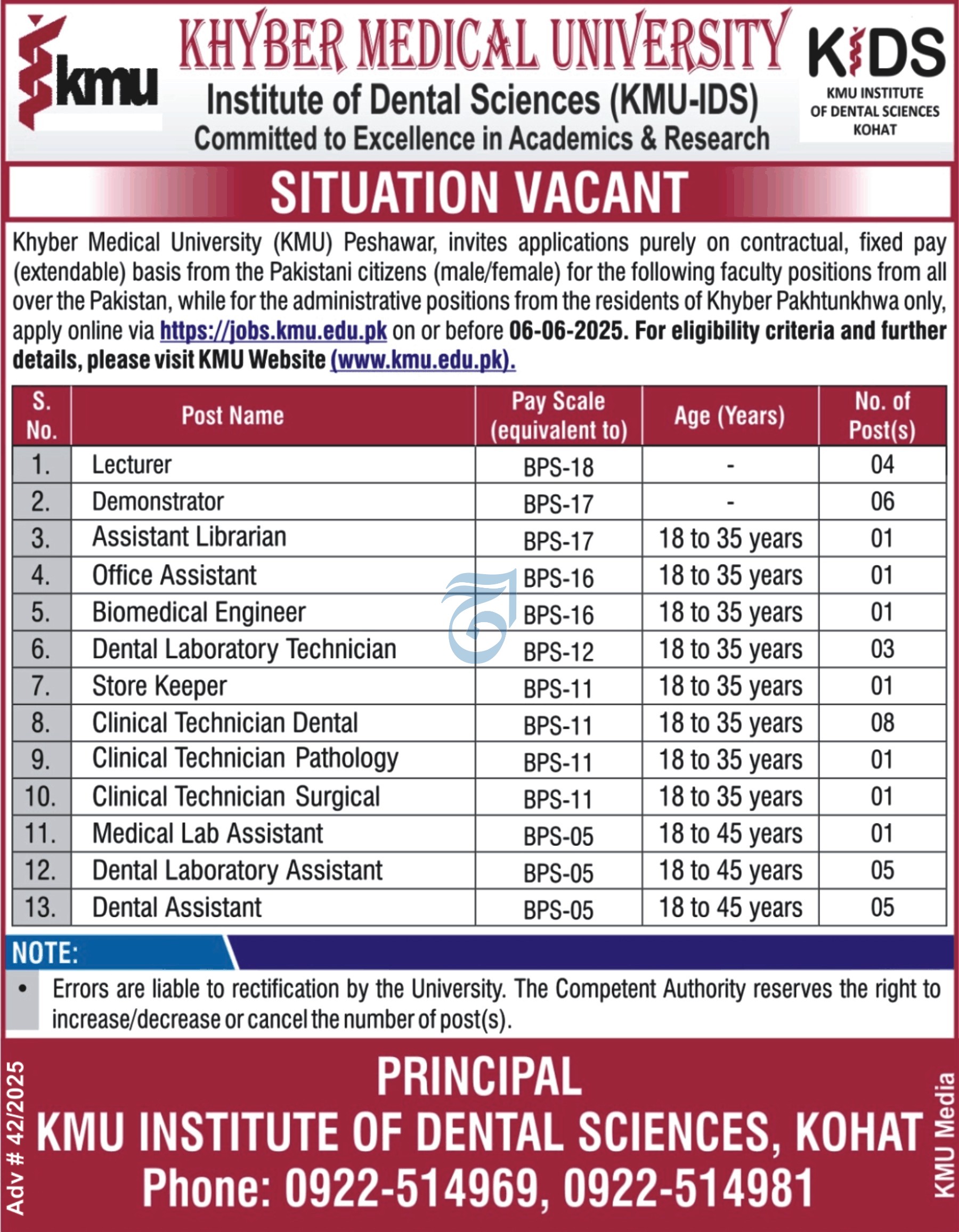 Vacant posts including assistant librarian, dental laboratory assistant, lecturer, dental laboratory technician, clinical technician dental, clinical technician surgical, store keeper, demonstrator, dental assistant, medical lab assistant and biomedical engineer are announced in Khyber Medical University KMU KDA Kohat Peshawar, kohat Khyber Pakhtunkhwa KPK Pakistan as per 17 May 2025 advertisement in daily Aaj Newspaper. Bachelor, MBBS, Others, Intermediate and BDS etc. educational qualification will be preferred.