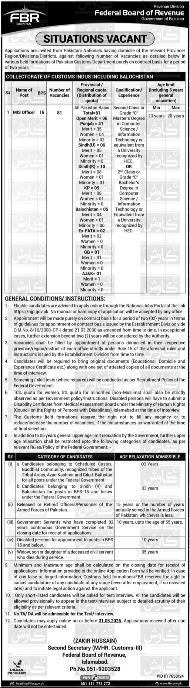 Latest jobs MIS Officer Jobs At Federal Board Of Revenue FBR Management Posts Islamabad jobs 2025/Apply Now