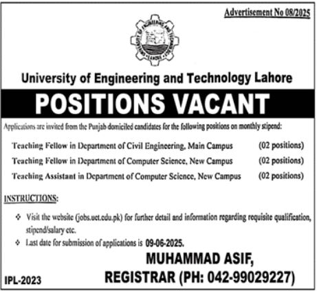 Vacant posts including teaching fellow are announced in University of Engineering and Technology UET Lahore, lahore Punjab Pakistan as per 23 May 2025 advertisement in daily Jang Newspaper. Educational qualifications required Master, Phd, Mphil and Bachelor etc.
