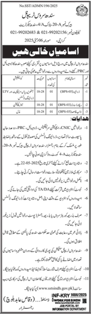 Sindh Service Tribunal is looking for candidates for posts as per job published in daily Newspaper Jang of May 7, 2025 for location Zulfiqar Commercial Area Karachi, Sindh Pakistan: