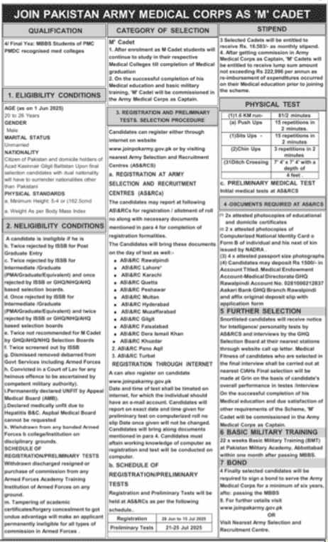 Pakistan Army jobs advertisement dated about 2 June 2025 in daily Jang Newspaper invites application for the vacant post of medical cadet in – Select Area – Islamabad, quetta, islamabad, swat, rawalpindi, gilgit and lahore Islamabad Pakistan. Persons with MBBS etc. education can apply.