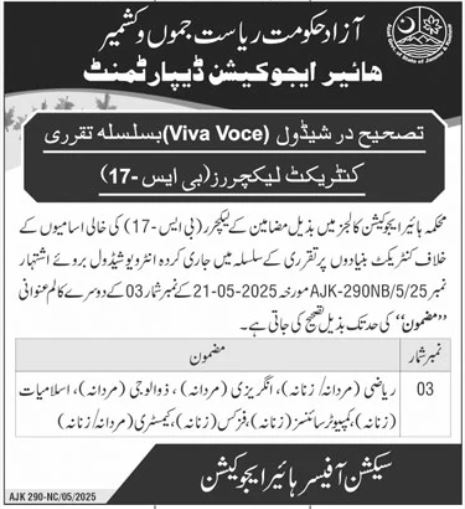 Higher Education Department invites applications for job positions advertised in daily Jang dated 23 May 2025 for following vacancies in Muzaffarabad, muzaffarabad AJK Pakistan.