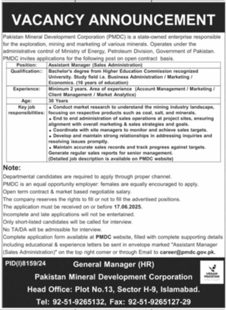 Pakistan Mineral Development Corporation jobs advertisement dated about 27 May 2025 in daily Jang Newspaper invites application for the vacant post of assistant manager in H-9 Islamabad, islamabad Islamabad Pakistan. Master, MS and Bachelor etc. educational qualification will be preferred.