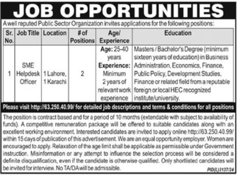 Vacant posts including sme helpdesk officer are announced in Public Sector Organization Lahore, lahore Punjab Pakistan as per 20 May 2025 advertisement in daily Ausaf Newspaper. MS, Master and Bachelor etc. educational qualification will be preferred.